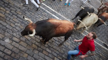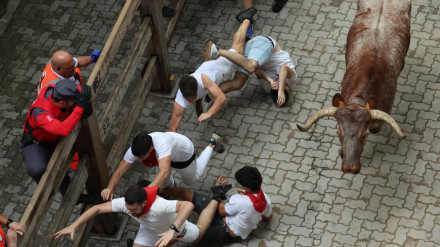 El cuarto encierro, de la ganadería Fuente Ynbro, ha dejado siete taslados al HUN, ninguno de ellos por herida de asta de toro