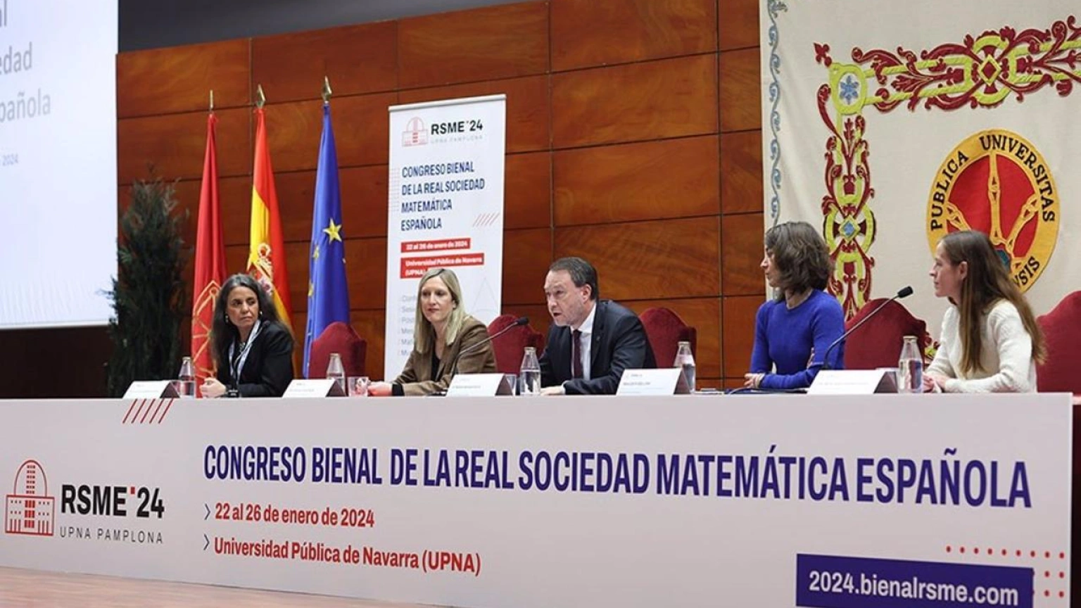 El acto contó con la presencia de Ramón Gonzalo, rector de la institución académica; Patricia Fanlo, consejera de Universidad, Innovación y Transformación Digital del Gobierno de Navarra; Maider Beloki, concejala de Cultura, Festejos y Educación del Ayuntamiento de Pamplona; Eva Gallardo, presidenta de la RSME; y Mª Jesús Campión, presidenta del comité organizador.
