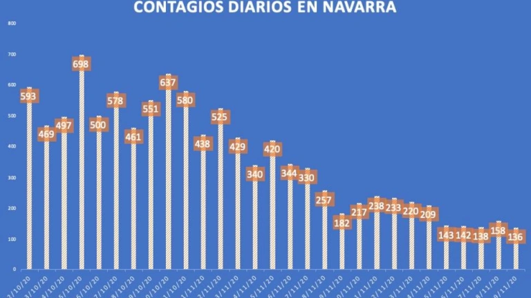 Navarra registró el miércoles 136 casos de Covid-19, un descenso frente a los 158 que se registraron el día anterior, si bien ha aumentado la positividad de las pruebas diagnósticas, ya que se ha situado en el 6,6% frente al 5,6% de la jornada del martes.