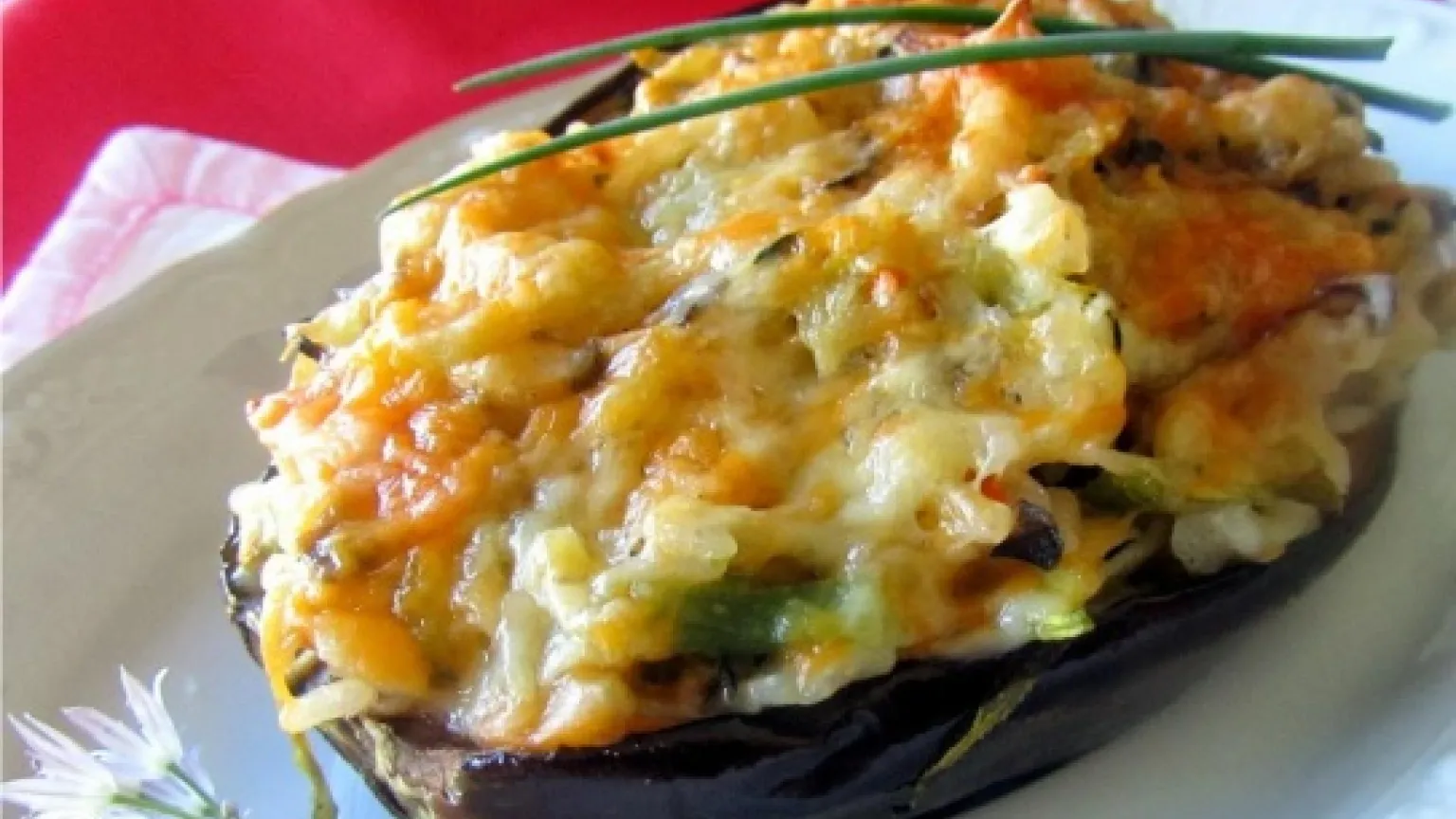 Cocer las berenjenas 4 minutos en agua hirviendo, Retirarlas y ponerlas a enfriar. Una vez frías cortarlas en dos mitades, vaciarlas dejando un borde de 1 centímetro. Cortar la pulpa en trozos pequeños sofreírla y mezclarla con el arroz.