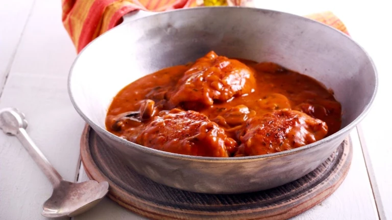 Contramuslos de pollo encebollados con salsa al vino tinto