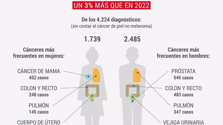 Los cánceres más frecuentes en los hombres fueron el de próstata (545 casos), colon y recto (483 casos), pulmón (347 casos) y vejiga urinaria (127 casos), que en conjunto suman el 60% del total. En las mujeres, destacan por su frecuencia el cáncer de mama (452 casos), colon y recto (248 casos), pulmón (145 casos) y cuerpo de útero (114 casos), que representan el 55% de los casos diagnosticados.