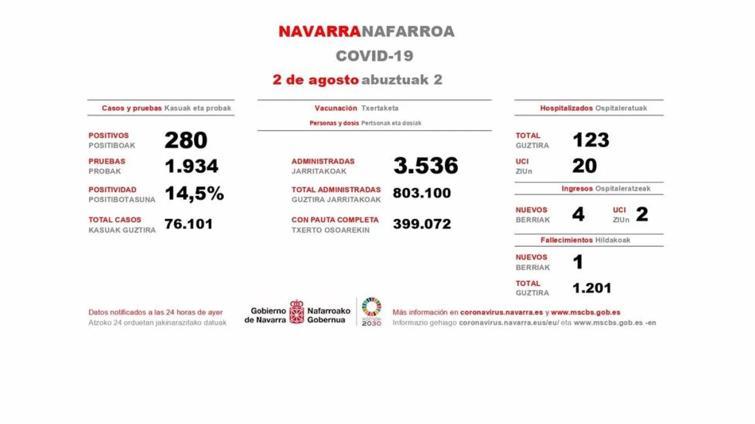 Asimismo, en el último día se ha registrado un fallecimiento en Navarra, por lo que el número de fallecidos por Covid desde el inicio de la pandemia se sitúa en 1.201.