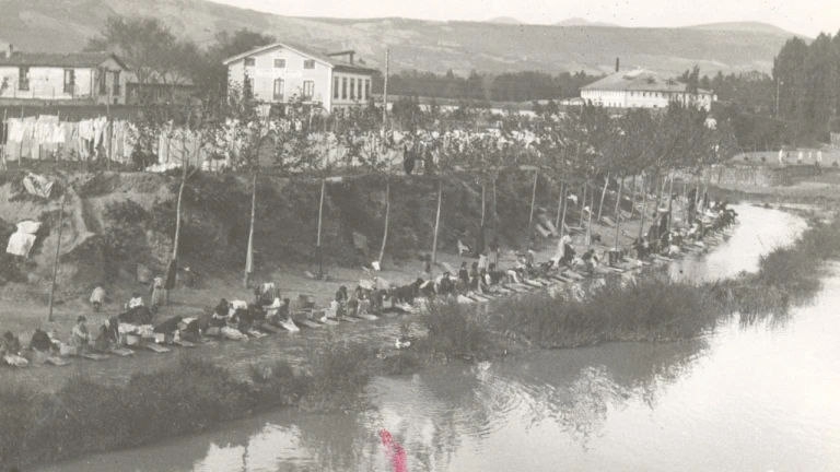 Un grupo de lavanderas en la orilla del Arga a su paso por Pamplona