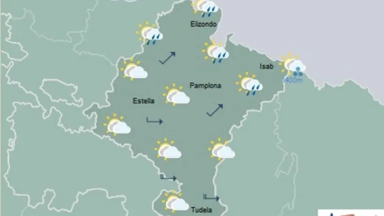 Para mañana desde AEMET la previsión en Navarra es de día nuboso o cubierto, excepto en el extremo sureste donde predominarán los intervalos. Lluvias y chubascos en el tercio norte, disminuyendo la probabilidad hacia el sureste. No se descarta que los chubascos sean localmente fuertes, persistentes y ocasionalmente con tormenta en la vertiente cantábrica. Cota de nieve a 1400 metros al principio subiendo hasta los 1600-1800. Temperaturas con pocos cambios. Viento de noroeste tendiendo a sur flojo por la tarde.