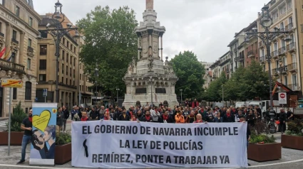 Más de un centenar de miembros de la Policía Foral se han concentrado junto al Monumento a los Fueros, en Pamplona, tras una pancarta en la que se podía leer 'El Gobierno de Navarra incumple la ley de Policías. Remírez, ponte a trabajar ya".