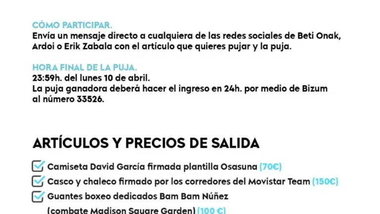Esta subasta solidaria está abierta hasta el 10 de abril a las 23:59. Las pujas se podrán realizar por medio de mensaje directo en las redes sociales de Ardoi Baloncesto, Gurpea Beti Onak Azparren Gestión y el piloto Erik Zabala. En esas mismas redes sociales se podrá ver qué artículos están en la subasta y el precio de salida.