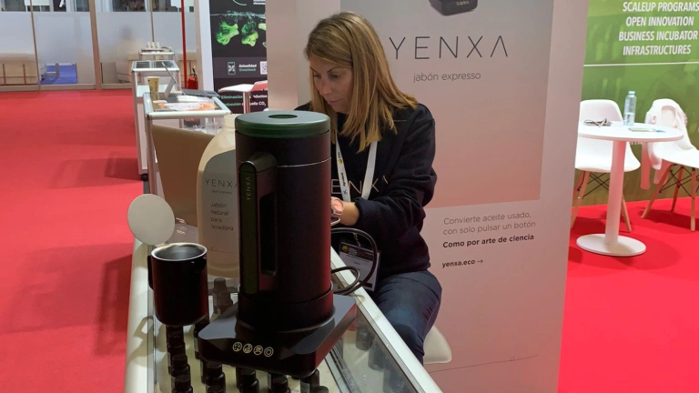 Explica sus líneas de actuación: “Trabajamos en dos líneas complementarias nuestro propósito y objetivo sí que era transformar el aceite en origen en productos de valor y a partir de ahí lo hacemos a través de dos líneas complementarias. Tenemos Yenxa Home, que es un pequeño electrodoméstico que transforma el aceite en un kit de cápsulas biodegradables. Lo obtenemos para las ventas para cualquier hogar, es decir, en cualquier hogar una persona de manera sencilla y automática se puede hacer su jabón partiendo del residuo de una fritura de una croqueta de una patata, etcétera. El dispositivo es muy parecido a una cafetera”.