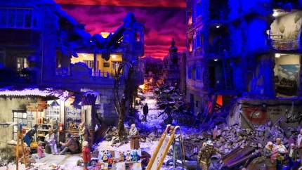 La Asociación de Belenistas de Pamplona, la más numerosa de España con más de 600 socios, ha inaugurado su tradicional exposición en Baluarte. Este año, entre la treintena de nuevas creaciones, una ha captado especialmente la atención del público por su dureza y realismo: un belén ambientado en la guerra de Ucrania que busca ser una denuncia social.