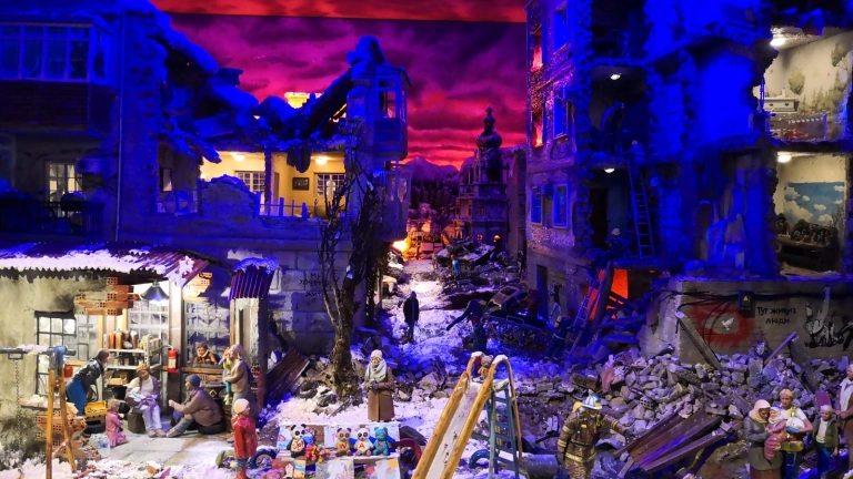 La histórica asociación de belenistas presenta su muestra anual en Baluarte con una impactante creación que busca visibilizar el sufrimiento en los conflictos armados