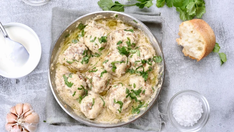 Napar las albóndigas con la salsa muselina, se gratina unos minutos y se sirve.