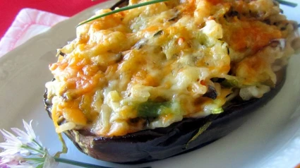 Después de reservar el arroz, se cuecen las berenjenas 4 minutos en agua hirviendo. Se retiran y se ponen a enfriar. Una vez frías, se cortan en dos mitades, se vacían dejando un borde de un centímetro, se corta la pulpa en trozos pequeños, se sofríe y se mezcla con el arroz.