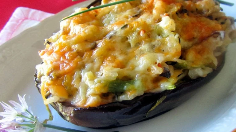 Por último, se rellenan las berenjenas con el arroz, se colocan en una fuente de horno, se espolvorea el queso rallado por encima y se hornean a 200ºC durante 7 minutos.