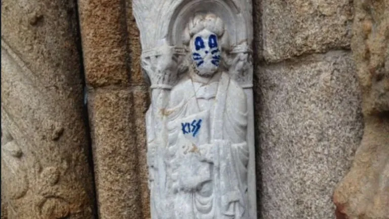 La fachada de Platerías de la catedral de Santiago de Compostela ha aparecido esta mañana con un grafiti en una de sus figuras, que aparece pintada emulando a uno de los miembros de Kiss, la banda estadounidense de 'hard rock'.