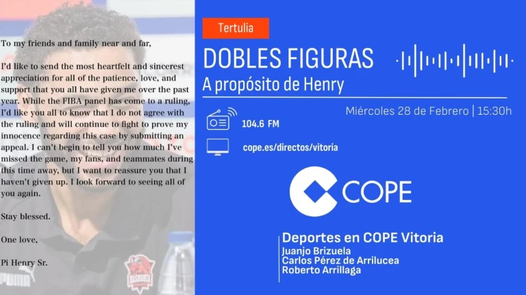 La tertulia de baloncesto Dobles Figuras de Deportes Cope Vitoria, tras muchos días sin basket en Vitoria-Gasteiz, se ha centrado en la noticia del recurso que piensa interponer Pierria Henry a la sanción de 4 años que le impuso la FIBA hace una semana. El asunto, bastante opaco, tiene varias preguntas aun sin responder. El jugador, después de 14 meses sin declaraciones, publicó en sus redes sociales una carta anunciando los pasos que iba a tomar tras la publicación de su inhabilitación: