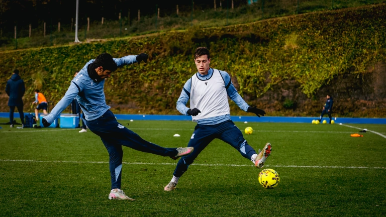 Guedes y Sucic disputan un balón durante un partidillo en Zubieta