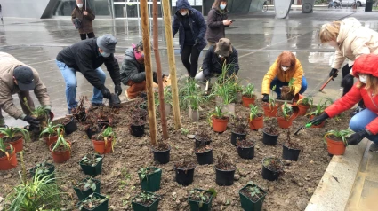 Vecinos del barrio han participado este lunes en una plantación popular en los nuevos parterres creados en la Travesía de Loiola, con 2.500 m2 recuperados para la ciudadania