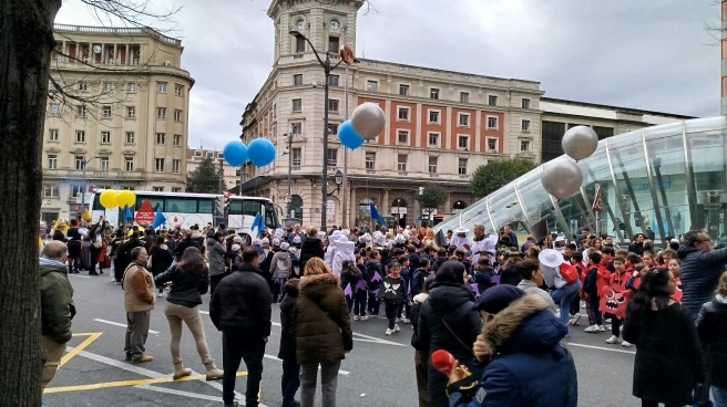 El carnaval escolar de Bilbao se refugia de la lluvia en la Plaza Nueva con una gran chocolatada