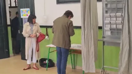 El candidato socialista a lehendakari, Eneko Andueza, al depositar su voto en Portugalete