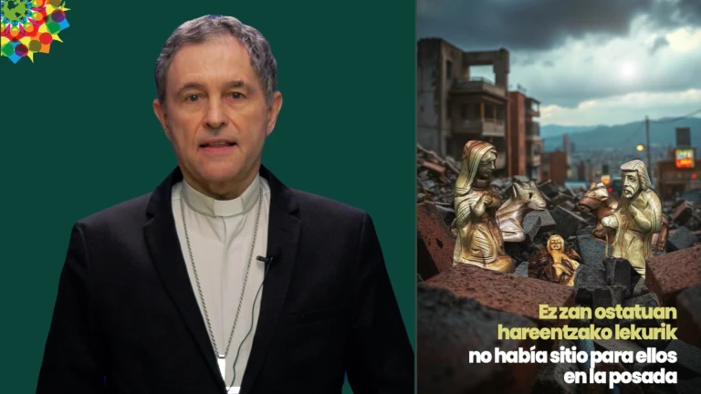 Joseba Segura subraya en su mensaje que, «entre escombros de guerra y desesperanza, una luz antigua y nueva vuelve a brillar en Belén». Se refiere al niño que nace entre ruinas, «vulnerable y sin hogar», quien es «paradójicamente», llave «para abrir muchas puertas cerradas».