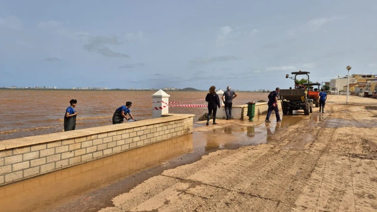 El Ayuntamiento de Cartagena mantiene el dispositivo de limpieza en las poblaciones del sur del Mar Menor y durante el domingo operaron en tres turnos para retirar barro en El Algar, Los Nietos, Playa Honda y Mar de Cristal.