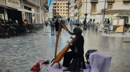 No solo detienen su paso los de fuera para aplaudirle y depositar alguna moneda en el cesto. También los de casa saben que la Plaza de San Sebastián es el trono de la Reina de 'Primaveralia', donde el frío se resiste a llegar y se disfruta del sonido envolvente de este arpa que nunca detiene el repertorio.