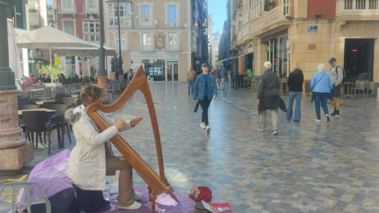 El talento de Elena Aker sigue encandilando a quienes pasean por el centro de Cartagena. El sonido de su arpa tiene algo hipnótico que hace que niños y mayores hagan algo que pasa pocas veces y es que despegan sus ojos de los dispositivos móviles que les llevan casi en un mundo paralelo. En cuanto suenan unos acordes es automático, se paran los rápidos que corrían con prisas. Muchos reconocen que pierden la noción del tiempo al dejarse llevar por sus melodías.