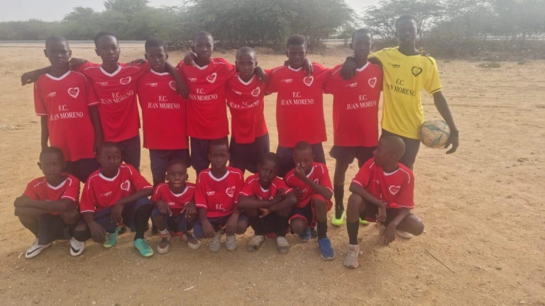 "Queríamos motivarlos y darles alegría". Con su proyecto y la colaboración de Cartagena por la Caridad lo han logrado. "El equipo se llama Fútbol Club Juan Moreno, y hemos mandado camisetas, pantalones, balones y están muy emocionados. Si la audiencia viera cómo juegan y los medios que tienen, ellos juegan descalzos a fútbol, ellos juegan un campo de tierra y, bueno, cada uno, pues, va con un color, una camiseta, un pantalón, los que podían, o con ropa de vestir".