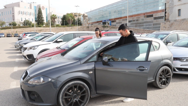 Dos jóvenes compartiendo vehículo en el aparcamiento del Campus Muralla del Mar