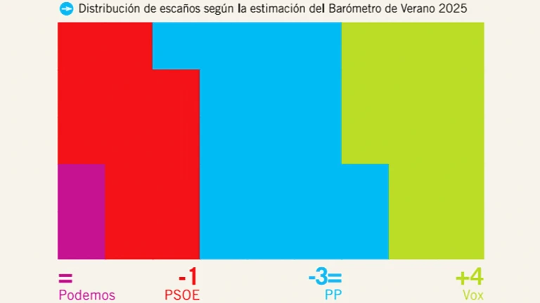 El PP ganarían las elecciones, pero baja a 18 escaños, frente a los 21 que consiguieron en 2023. El PSOE obtendría 12 diputados, uno menos; Vox conseguiría cuatro escaños más, superando a los socialistas y colocarse con 13, mientras que Podemos se mantendría con dos diputados.