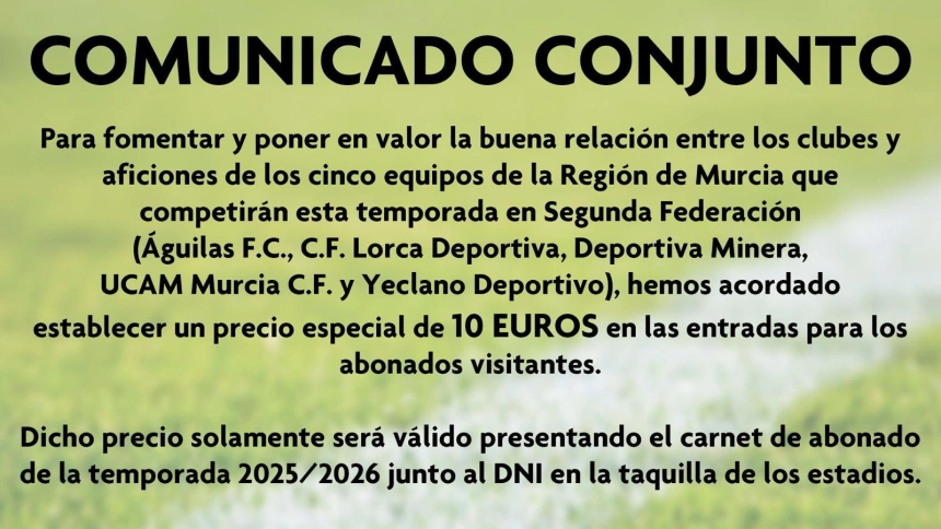 Esto es posible, gracias al acuerdo que han firmado los equipos murcianos del grupo IV de Segunda RFEF, CF Lorca Deportiva, Águilas FC, Deportiva Minera, UCAM y Yeclano Deportivo, por el cual sus "abonados" pueden acudir a los partidos en los que su equipo juegue como visitante ante resto de equipos de la región con una entrada de 10€.