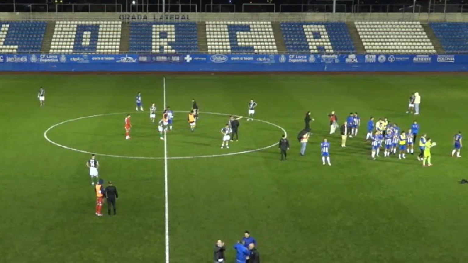 Momento del final del partido y los jugadores del CF Lorca Deportiva saludan a sus aficionados en las gradas del Artés Carrasco.