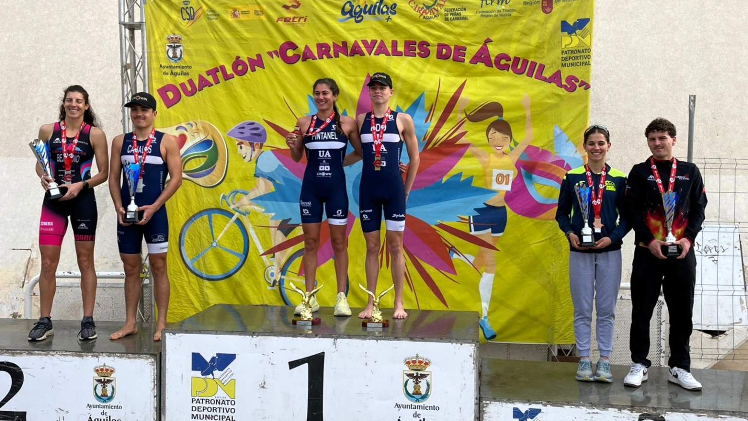 Marta Pintanel e Izan Edo, ambos del Universidad de Alicante Triatlón, han vuelto a imponerse en el Duatlón Carnavales de Águilas, que se ha celebrado hoy. La prueba era el primer clasificatorio para el Campeonato de España de Duatlón 2026 que tendrá lugar en [Cáceres]. La cita ha reunido a cerca de quinientos deportistas de diferentes categorías.