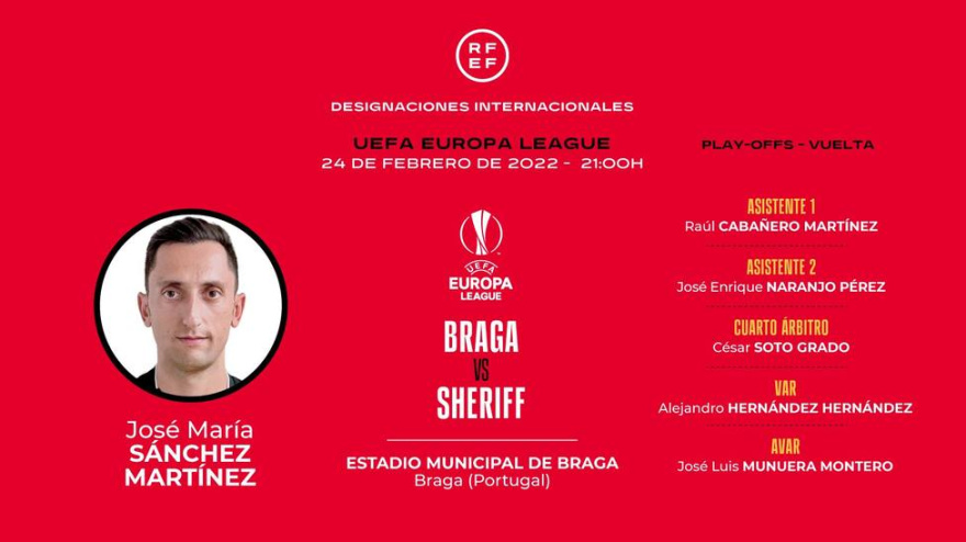 El lorquino volverá a dirigir un partido de competición europea, será en Braga, el duelo entre el cuadro luso y el Sheriff, que cayó eliminado del grupo Champions del Real Madrid
