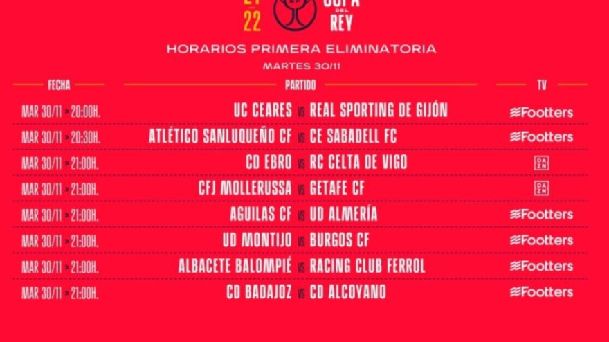 La primera ronda de Copa del Rey se jugará entre el 30 de noviembre, 1 y 2 de diciembre. Todos los partidos serán televisados por las plataformas Footters o DAZN.