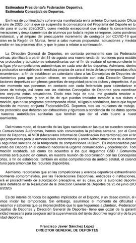 31 agosto nueva reunión para planificar protocolos Covid-19. Se establecerán medidas inicio pretemporada. Hasta entonces no se programan entrenamientos.