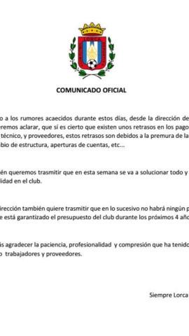 El CF Lorca Deportiva acumula atrasos en la plantilla, cuerpo técnico, empleados y provedores, que se esperan solucionar esta semana.