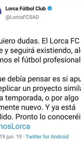 El empresario madrileño utiliza la cuenta oficial del club en Twitter para indicar que "el Lorca FC existe y existirá" y que pronto se conocerán detalles