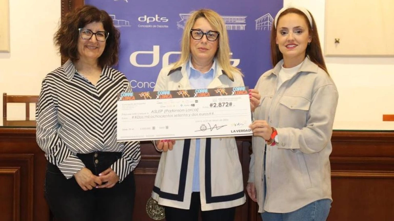 y la responsable comercial de La Verdad, Ascensión Trenza, han hecho entrega del cheque con la recaudación de la carrera CorrexLorca a la presidenta de la Asociación Lorquina de Enfermos de Parkinson (ASLEP), Isabel Morales.