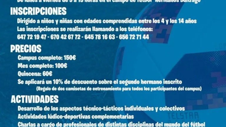El campus completo tendrá un precio de 150 euros, mientras que el mes completo tendrá un precio de 100 euros y la quincena un precio de 60 euros. Se aplicará un 10% de descuento sobre el segundo hermano inscrito.