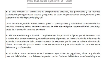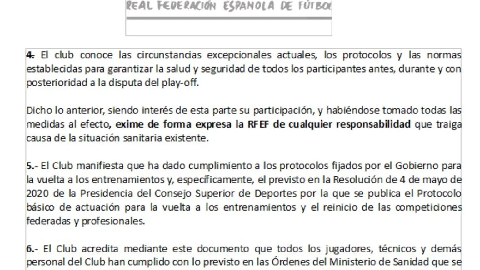 Uno de los epígrafes que más molestan a los clubes es el cuarto, donde señala que "siendo de interés de esta parte su participación, y habiéndose tomado todas las medidas al efecto, exime de forma expresa la RFEF de cualquier responsabilidad que traiga causa de la situación sanitaria existente".