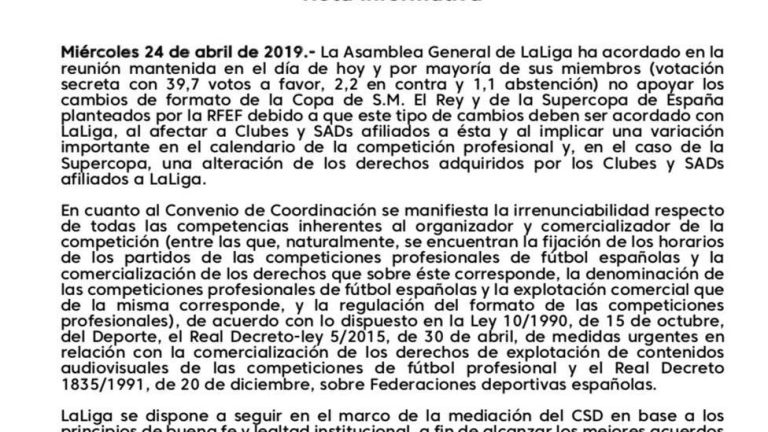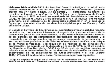 En esta reunión se ha acordado y por mayoría de sus miembros a través de votación secreta de 39,7 votos a favor, 2,2 en contra y 1,1 abstención, no apoyar los cambios de formato de la Copa de S.M. El Rey y de la Supercopa de España planteados por la RFEF debido a que este tipo de cambios deben ser acordado con LaLiga, al afectar a Clubes y SADs afiliados a ésta y al implicar una variación importante en el calendario de la competición profesional y, en el caso de la Supercopa, una alteración de los derechos adquiridos por los Clubes y SADs afiliados a LaLiga.