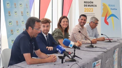 La alcaldesa de Águilas, Mari Carmen Moreno, el edil de Deportes, Cristóbal Casado, el director general de Deportes, Fran Sánchez, el presidente de la Federación Murciana de Triatlón, Diego Calvo, y el director de Competiciones de la Federación Española de Triatlón, Jorge García, han presentado esta mañana en rueda de prensa la XXXVI edición del Triatlón Marqués de Águilas; un evento deportivo que se celebrará en la localidad los días 4 y 5 de junio.