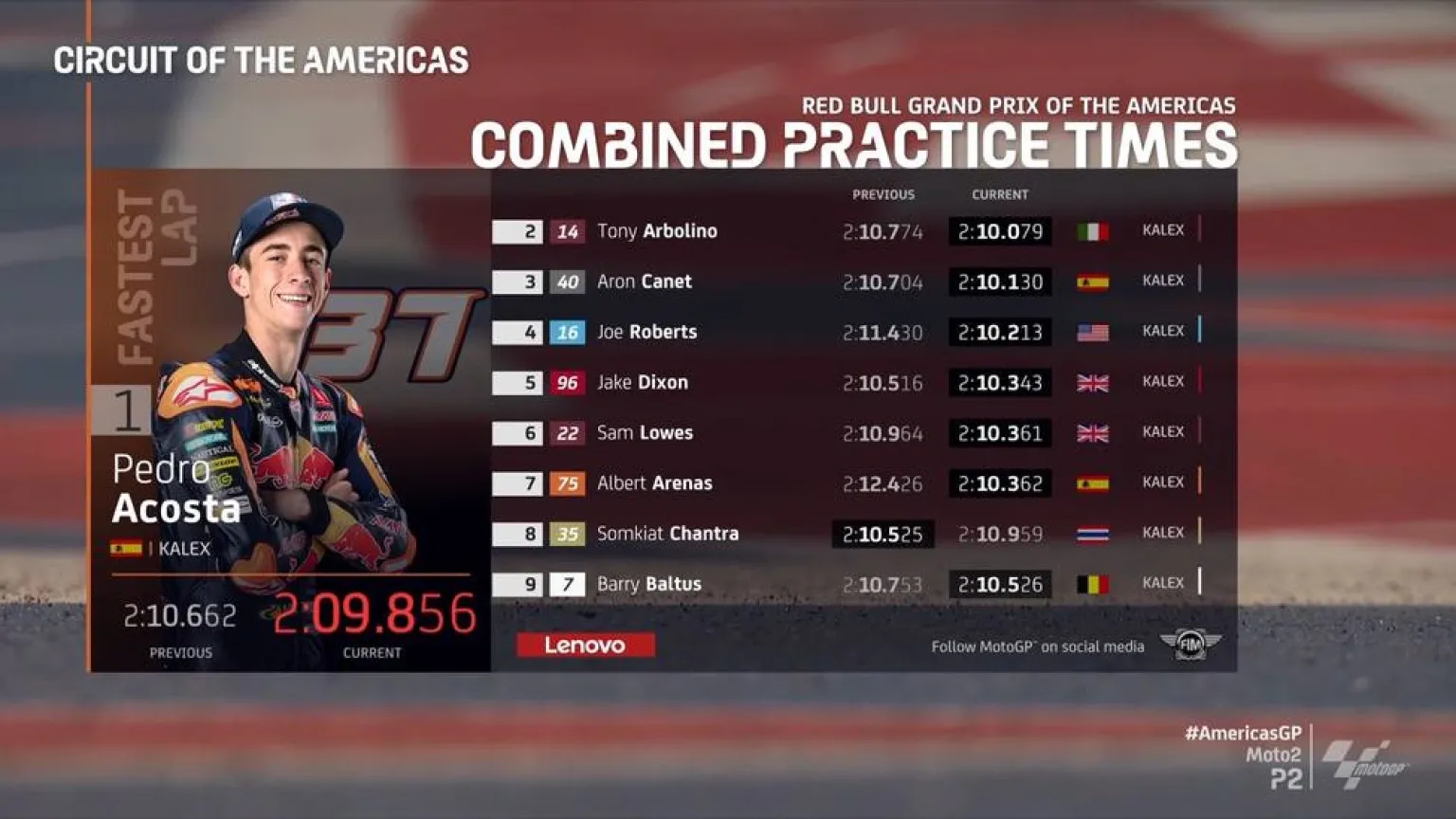 El Tiburón de Mazarrón fue el más rápido en el Circuito de las Américas en Moto2 durante la primera jornada de entrenamientos. El "37" marcó un tiempo de 2.09.856