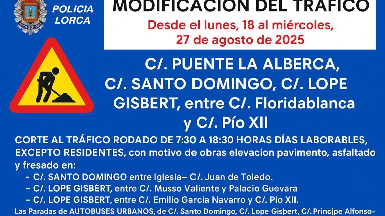El Ayuntamiento de Lorca ha informado que desde hoy lunes, y hasta el miércoles 27 de agosto, estará cortado al tráfico, Calle Puente de la Alberca, Santo Domingo y Calle Lope Gisbert en el tramo entre Floridablanca y Pío XII.