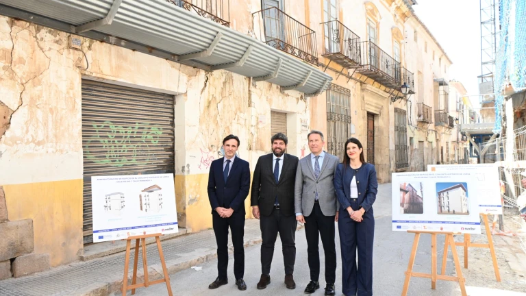 El presidente de la Comunidad, Fernando López Miras, y el alcalde de Lorca, Fulgencio Gil, han supervisado el inicio de los trabajos de rehabilitación de este edificio, de propiedad municipal, en el que se derribará el interior y se construirán cinco viviendas y un local comercial adaptados a personas con movilidad reducida.