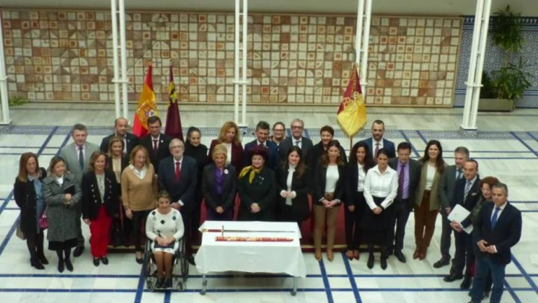El Patio de los Ayuntamientos de la Asamblea Regional ha acogido la presentación de la réplica de la vaina ceremonial de los Reyes Católicos, realizada a iniciativa de la Fundación San Clemente de Lorca y que ha sido bordada en sedas y oro por Silvia Teruel. Al acto ha asistido una amplia representación parlamentaria encabezada por el presidente de la Asamblea Regional, Alberto Castillo, así como Luis Torres del Alcázar, presidente de la Fundación San Clemente de Lorca, y Nines Mazuecos, concejala de Cultura, Universidad, Patrimonio Histórico y Casco Histórico del Ayuntamiento de Lorca.