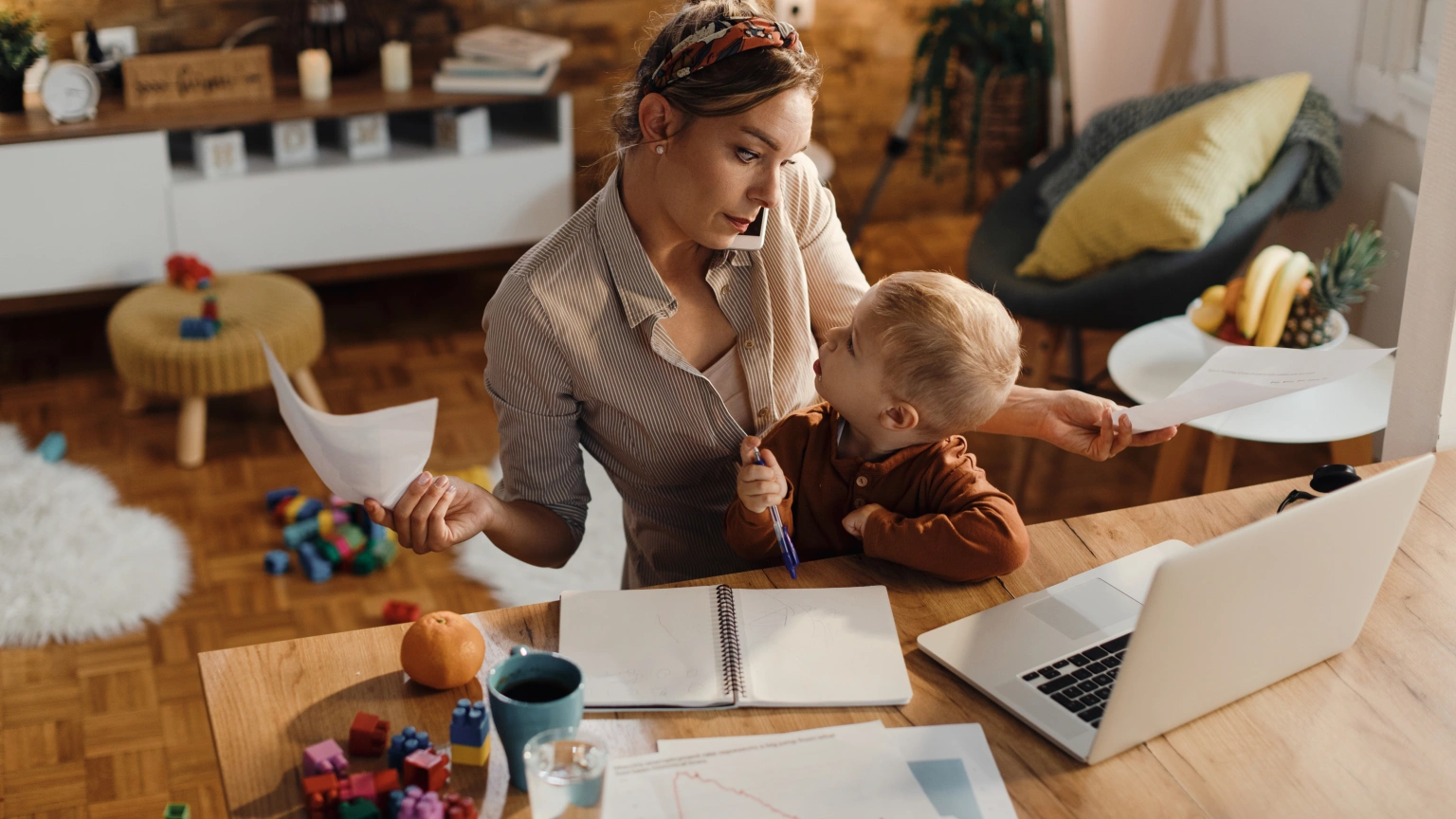 Una madre trabaja mientras cuida a su bebé