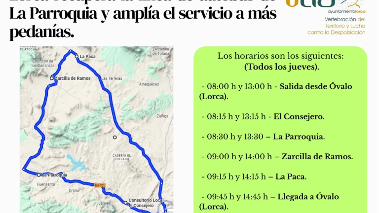 El servicio funcionará como una ruta circular, con salida y llegada en el Óvalo de Santa Paula (Lorca), y con paradas intermedias en El Consejero, La Parroquia, Zarcilla de Ramos y La Paca.