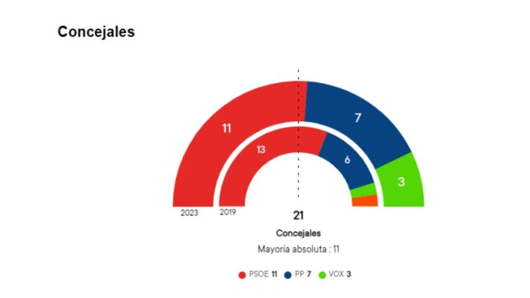El PSOE seguirá gobernando Águilas por tercer mandato consecutivo con 11 concejales, la cifra que marca la mayoría en el ayuntamiento, aunque pierde dos ediles respecto a las municipales de 2019.